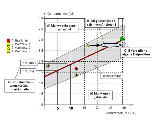 Mit dem Kundennutzen wird eine neue Orientierungsgröße zur Verfügung gestellt, die eine belastbare Einschätzung der eigenen Markterfolgspotentiale erlaubt, wie in nachfolgender Grafik gezeigt wird: