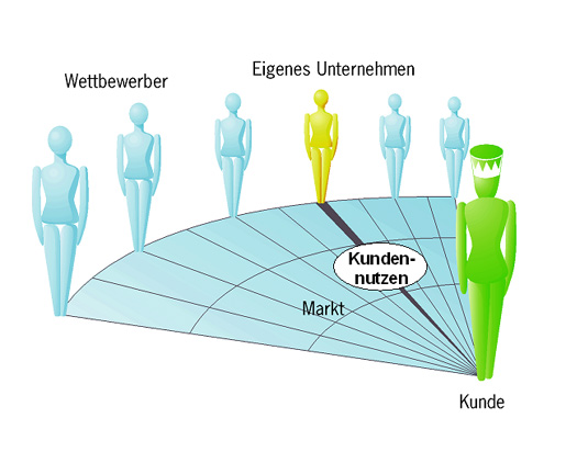 Mit dem Kundennutzen wird eine neue Orientierungsgröße zur Verfügung gestellt, die eine belastbare Einschätzung der eigenen Markterfolgspotentiale erlaubt, wie in nebenstehender Grafik gezeigt wird. Diese Grafik erlaubt z. B. folgende Aussagen: