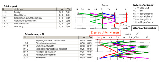 Abb. 3: Stärken - Schwächenprofil der industriellen Abwasseranlage. Diese Informationen sind gut für eine SWOT Analyse geeignet. Das Stärkenprofil eignet sich darüber hinaus gut für die Entwicklung einer Verkaufsargumentation. Im Schwächenbereich sind vor Allem Verbesserungsmaßnahmen zu entwickeln