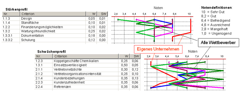Über ein lineares Scoring Verfahren werden die eigenen Leistungen und die der Wettbewerber erfasst. Ziel ist es, dass das eigene Unternehmen hohe Kundennutzenwerte erzielt, da diese ein direktes Maß für die eigene Wettbewerbsstärke sind.