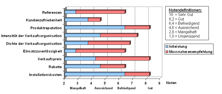 Hier sind erhebliche Defizite für das eigene Unternehmen erkennbar, da die Schwächen aus-nahmslos an wichtigen Kriterien auftreten, wohingegen die Stärken eher unwichtige Kriterien betreffen. (Die Bedeutung der Kriterien im Kaufentscheidungsprozess der Kunden wird über den Stufengewichtungsfaktor "SW" beschrieben)