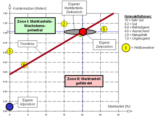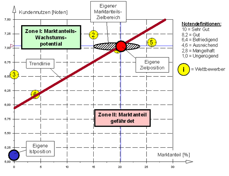- Welche Kundennutzenwerte müssen bei bestimmten Zielmarktanteilen erreicht werden?