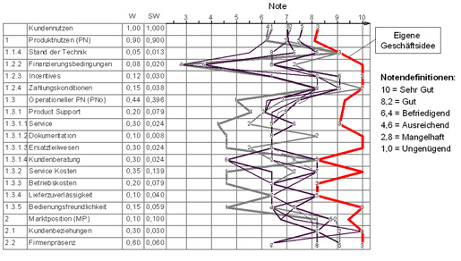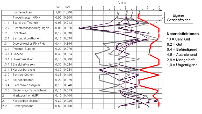 Die Kundennutzenanalyse analysiert den Kaufentscheidungsprozess eines durchschnittlichen Kunden in einem definierten Markt. Der von ihm tatsächlich wahrgenommene Nutzen, der Kundennutzen ist ein direktes Maß für die Wettbewerbsstärke aller untersuchten Anbieter. Bei einer innovativen Geschäftsidee wird dieser mit im Markt bestehenden Problemlösungen verglichen. Methodische Vorgaben stellen sicher, dass dieser Kundennutzen umfassend erhoben wird. Ziel ist es, dass die eigene Geschäftsidee hohe Kundennutzenwerte erzielt.