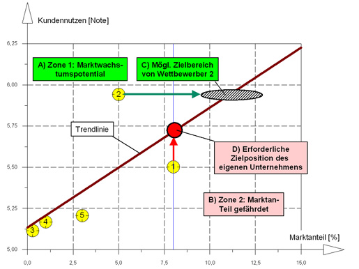 - D: Erforderliche Zielpositionen für den eigenen Kundennutzen, Zielkundennutzen für angestrebte Marktanteile, Risikoanalysen