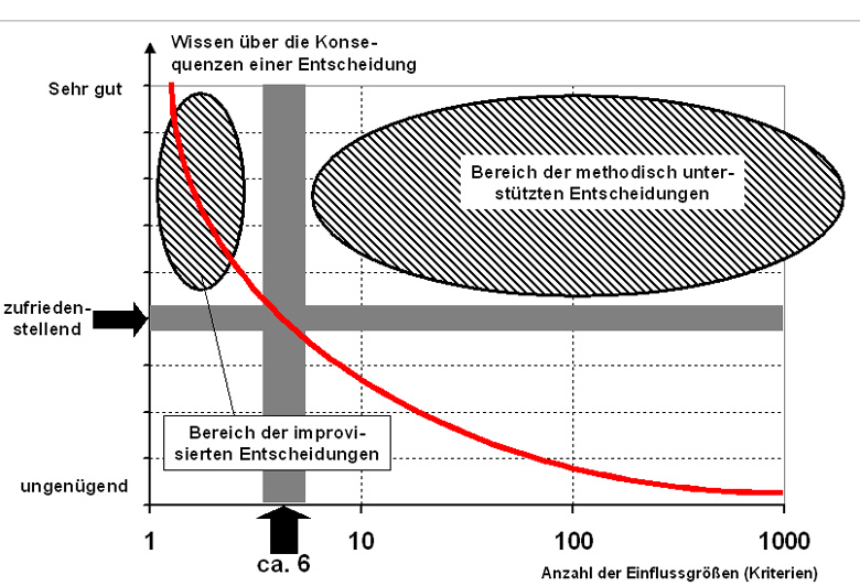 Ab sechs Einflussgrößen werden Entscheidungsprozesse unüberschaubar. Ab hier ist eine methodische Unterstützung angebracht. Die wird mit zunehmender Zahl immer wichtiger.