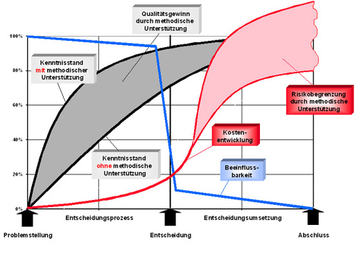 Qualitätsgewinne im Entscheidungsprozess und Risikominderungen in der Entscheidungsumsetzung rechtfertigen eine methodische Unterstützung von Entscheidungsprozessen. Bereich "A": bei noch geringen Kosten und bei noch hoher Beeinflussbarkeit wird durch eine methodische Unterstützung der größte Kenntnisgewinn erzielt.