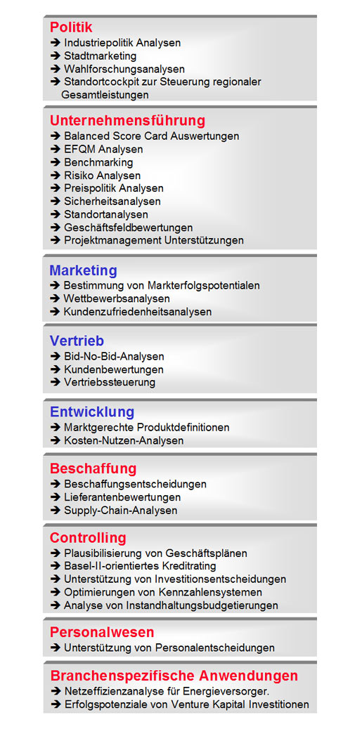 Die decisionMaker© und die KNA© Verfahren haben in einem breiten Spektrum von Anwendungen ihre Aussagekraft und ihre Praxistauglichkeit bewiesen. Nachfolgend wird eine Gesamtübersicht über die bislang praktizierten Anwendungen gegeben. Einige ausgewählte Kurzbeschreibungen zeigen die Praxis der Anwendungen. Das Spektrum der Anwendungen wird ständig erweitert.